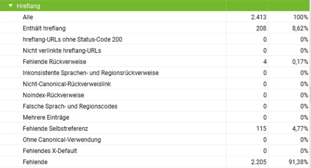Porsche.com verwendet das sogenannte hreflang-Tag. Das bedeutet, dass es verschiedene, länderspezifische Domains gibt (z.B. porsche.com/germany/ oder porsche.com/france/) auf die Nutzer anhand ihres Standorts automatisch bei Eingabe der Haupt-URL geleitet werden. Für den Fall, dass keine eindeutige Zuordnung erfolgen kann, existiert eine Fallback-Lösung (porsche.com/international/). Allerdings hat Porsche die hreflang-Tags nicht konsistent umgesetzt. Dies wird ersichtlich, da 5.959 Missing Return Links und 4.713 Noindex Return Links existieren. Hreflang funktioniert immer nur bidirektional. Das bedeutet: Wenn eine URL auf eine andere (Länder-)URL verweist, dann muss diese andere URL auch wieder auf die Ursprungs-URL zurückverweisen. Damit wird sichergestellt, dass die verweisende Seite auch die Autorität über die Verweisseite besitzt.