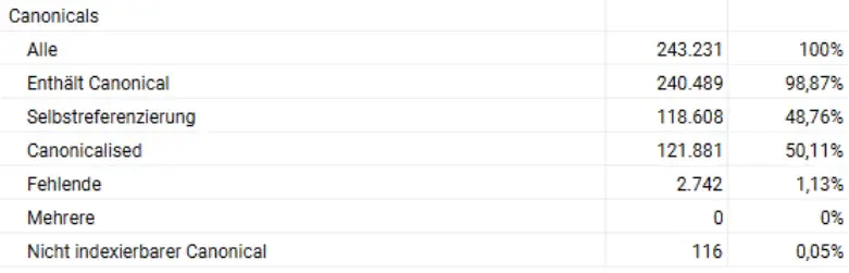 Nur rund 50 % der URLs haben einen selbstreferenzierenden Canonical, sind also indexrelevant. Hier stellt sich jedoch die Frage, warum dann die anderen 50 % der URLs existieren, wenn diese kein Original sind.