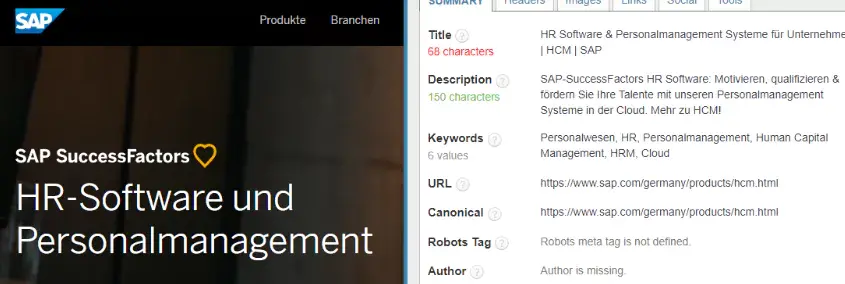 Bei sap.com werden auch Keywords über das Meta-Keywords-Tag gepflegt, dieses wird jedoch von Suchmaschinen ignoriert und hilft höchstens den Mitbewerbern bei der Keyword-Recherche.