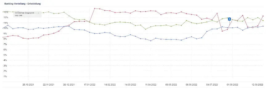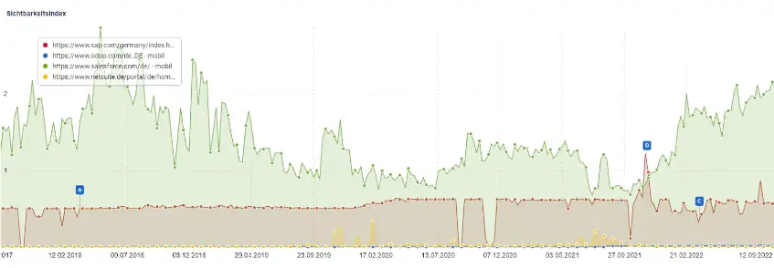 sap.com ist im Vergleich zur Konkurrenz gerade noch befriedigend aufgestellt. Zwar ist die Sichtbarkeit nicht vollkommen abgeschlagen, die Rankings zeigen jedoch, dass hier kaum bis kein Aufwand betrieben wird, um besser gefunden zu werden. Hier sollten SEO-Maßnahmen ergriffen werden, um nicht nur aufgrund der Brand-Bekanntheit gefunden zu werden.