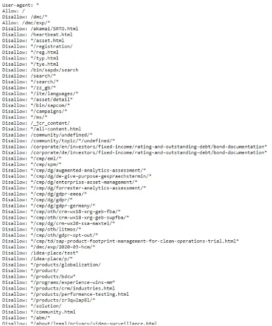 Die robots.txt sperrt viele Verzeichnisse und auch spezifisch für bestimmte Crawler. SAP sollte jedoch prüfen, ob und welche Verzeichnisse vom Crawling ausgeschlossen werden können und dadurch etwas Crawling Budget sparen.