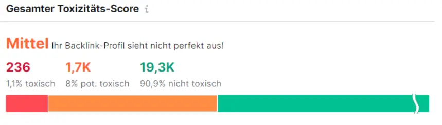 Insgesamt wird die Schädlichkeit des Backlinkprofils als Mittel eingestuft, hier besteht also teilweise Handlungsbedarf. Wichtig zu erwähnen ist, dass das Backlinkprofil der Domain insgesamt zu groß ist, um sie mit gängigen Tools komplett analysieren zu können – daher dient die Auswertung eher als Richtwert zur Orientierung.