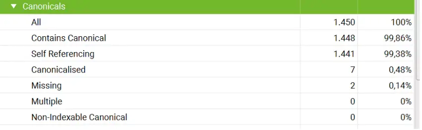 Der Canonical Tag fehlt auf 2 Seiten, wie oben im Screenshot zu erkennen ist. Um Duplicate Content zu vermeiden, sollte dieser dringend auf allen Seiten ausgezeichnet werden. Auch ein selbstreferenzierender Canonical (ein Canonical der URL mit dem Inhalt der eigenen URL) ist empfehlenswert, um sicherzustellen, dass es sich um die Original-Ressource handelt, selbst wenn es keine Duplikate gibt. Dieses Kriterium erfüllen 99,38 % der Seiten. Hier sollten die restlichen URLs optimiert werden, insgesamt ist der Canonical-Tag bei siemens-energy.com jedoch gut gepflegt.
