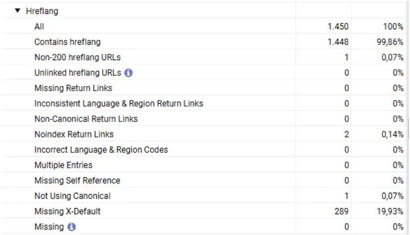 Wie im Screenshot aus Screaming Frog zu sehen ist, ist auf knapp 20 % der Seiten kein x-default ausgezeichnet. Das sollte nachgeholt werden. Lediglich ein hreflang-Attribut verweist auf eine Seite, die keinen 2xx-Statuscode wiedergibt. Außerdem wird auf 2 Seiten, die nicht indexierbar sind, und auf eine Seite, die nicht kanonisch ist, mit dem hreflang-Attribut verwiesen. Hier sollten der hreflang glatt gezogen werden.