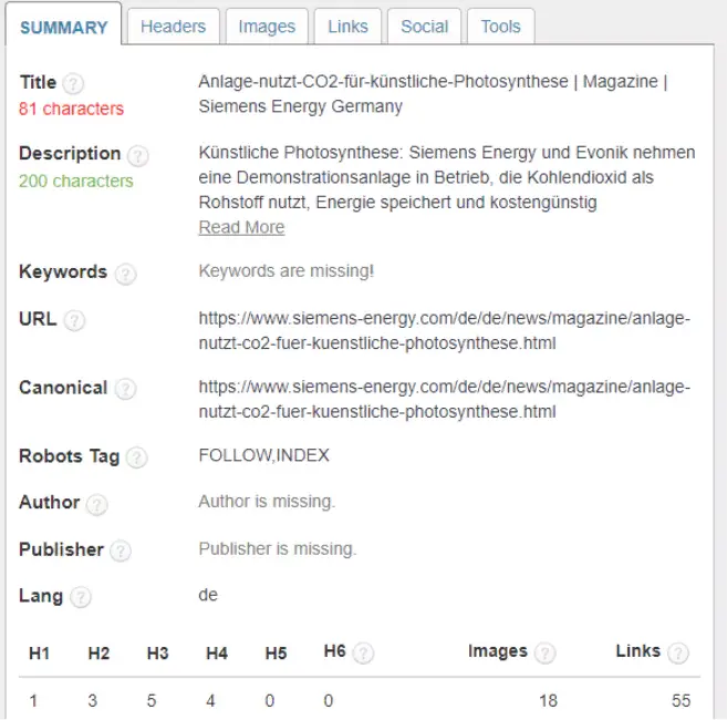 Bei siemens-energy.com werden zum Teil Keywords über das Meta-Keywords-Tag gepflegt, diese sollten entfernt weden. Bei über 28 % der Seiten ist keine Meta-Description hinterlegt. Zudem gibt es Duplikate bei Titles und Meta-Description, obwohl diese einzigartig sein sollten.