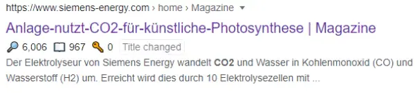 Die Keyword-Konsistenz sollte bei den Newsseiten angepasst werden, so sollte das Hauptkeyword in dem Title, in der Meta-Description aber auch in der H1-Überschrift verwendet werden. Da die Seite bereits für das Keyword “künstliche photosyntese” oder “co2 elektrolyse” rankt, könnte hierbei, je nach Relevanz das Hauptkeyword ausgewählt und für den Title und Meta-Description verwendet werden. Auch die Überschriftenstruktur sollte dringend angepasst werden. So beinhaltet die Seite https://www.siemens-energy.com/de/de/news/magazine/anlage-nutzt-co2-fuer-kuenstliche-photosynthese.html keine richtige Überschriften-Struktur. Zudem werden Informationen des Cookie-Banners in den Hx-Strukturen auf jeder Seite abgebildet.
