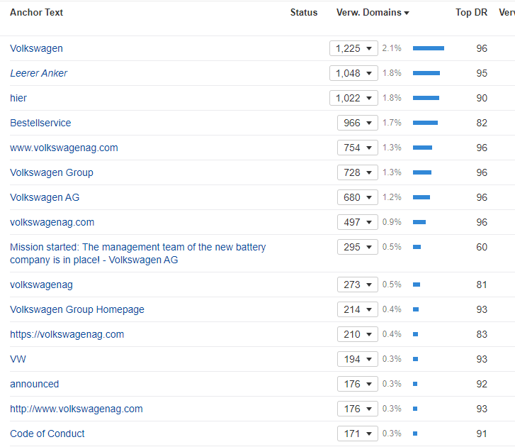 Die Anchor von volkswagenag.com sind zum Großteil Brand-Keywords (“Volkswagen”, “Volkswagen Group”) oder es existieren erst gar keine Ankertexte (“Leerer Anker”). Vereinzelt tauchen generische Anker auf (“hier”, “announced”) und nur ein Anker könnte möglicherweise der Money-Kategorie zugeordnet werden (“Bestellservice”). Insgesamt sind die Ankertexte von Volkswagen unauffällig, da keine übermäßige Nutzung von Money-Keywords feststellbar ist. Aufgrund der Prominenz von Volkswagen ist es natürlich, dass sehr viele Brand-Anchor existieren – dies stellt jedoch kein Problem dar.