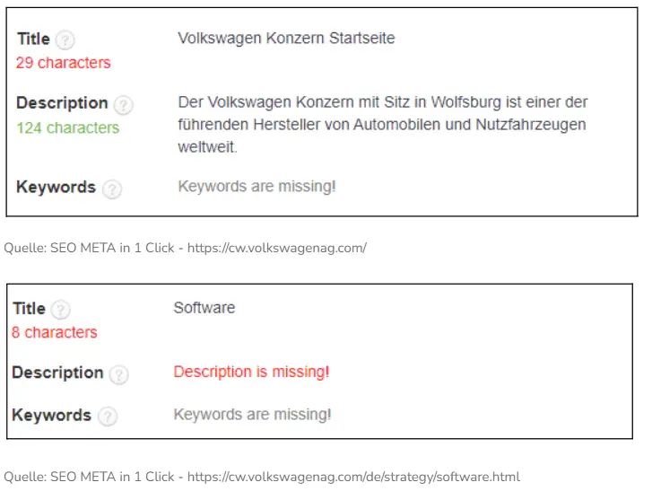 Meta Descriptions sollten ebenfalls relevante Keywords enthalten. Im zweiten Screenshot wird deutlich, dass Volkswagen für einige Landingpages überhaupt keine Beschreibung eingepflegt hat. Das ist suboptimal, da Suchmaschinen so nicht eindeutig identifizieren können, welche Inhalte die entsprechende Seite für einen Nutzer bietet. Dies wirkt sich logischerweise negativ auf das Ranking aus.