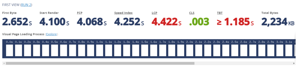 Für diese Analyse wurde die Homepage von Volkswagen getestet (“volkswagen.com”). Insgesamt performt Volkswagen nur für die CLS-Metrik akzeptabel. Folgende Einordnung der Metriken kann anhand der Ergebnisse von webpagetest vorgenommen werden: