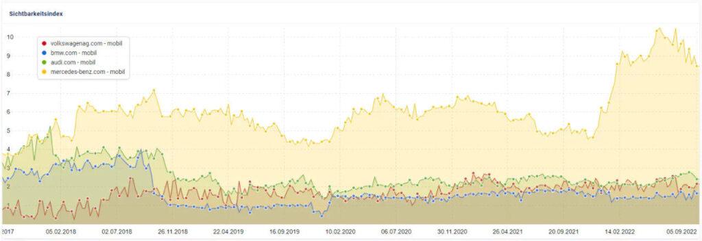 Die Sichtbarkeit der Volkswagen AG befindet sich seit 2018 auf einem einigermaßen gleichbleibenden Niveau. Wie jeder Sichtbarkeitsindex unterliegt auch der Index der VW AG permanenten Schwankungen, allerdings liegen diese immer nah um einen Sichtbarkeitswert von 2,0. Die Konkurrenz-Domains audi.com und bmw.com bewegen sich auf einem sehr ähnlichen Niveau. Unangefochtener Spitzenreiter in Sachen Sichtbarkeit ist die Domain von Mercedes-Benz. Diese übersteigt die Konkurrenz mit einem Sichtbarkeitswert von ca. 8,5 deutlich. Auffällig ist ein rasanter Anstieg seit Jahresbeginn 2022. Möglicherweise hat Mercedes-Benz ab diesem Zeitpunkt deutlich in die Optimierung seiner Domain investiert. Für die Volkswagen AG bietet sich definitiv das Potenzial, sich mit geeigneten Maßnahmen sichtbarer als die direkten Konkurrenten Audi und BMW zu machen.
