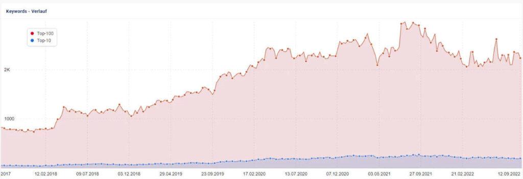 Die Anzahl der Keyword-Rankings ist ebenfalls ein Indikator für den Erfolg der SEO-Strategie. Ein Ranking steht hierbei stellvertretend für einen Suchbegriff, über welche die Website theoretisch gefunden werden kann. Theoretisch deshalb, weil ein Position 19 Ranking zu sehr wenig Traffic führen wird, weil sich kaum ein Nutzer zu Seite 2 von Google navigiert. Daher ist neben der reinen Anzahl an Rankings auch die Position relevant, vor allem die Anzahl der Top-10 Rankings.