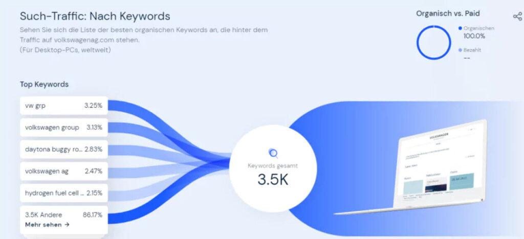 Die Top-Keywords hinter dem organischen Traffic sind teilweise Brand-Keywords wie “volkswagen group”, teilweise aber auch generische Begriffe wie “hydrogen fuel cell”. Es ist immer wünschenswert, wenn eine Domain neben offensichtlichen Brand Rankings auch generische Rankings erzielt. Dies ist laut similarweb für die Top Keywords der Fall. Hier sind zwei der Top 5 Keywords generisch, die restlichen drei Keywords können der Marken-Kategorie zugeordnet werden.
