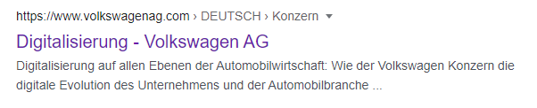 Ein Beispiel für einen nicht optimal ausgespielten SERP-Eintrag stellt die Landingpage zum Thema Digitalisierung dar. Hier wird direkt anhand der “…” in der Beschreibung deutlich, dass die eingepflegte Description zu lang ist. Die Folge: Google schneidet den Eintrag nach Erreichen der maximalen Zeichenlänge einfach ab. Das ist suboptimal, da der Nutzer somit mit einer unvollständigen Beschreibung konfrontiert wird und im Worst Case nicht identifizieren kann, welche Inhalte ihm die angezeigte URL wirklich bietet. Dies verdeutlicht, wie wichtig die Einhaltung der Zeichenlänge beim Einpflegen von Titles & Descriptions ist.