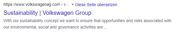 Im Screenshot oberhalb haben wir Ihnen exemplarisch das Snippet der Landingpage zum Thema Nachhaltigkeit der Volkswagen AG eingefügt. Title und Description entsprechen den allgemeinen Vorgaben hinsichtlich der Zeichenlänge, bzw. Pixelanzahl. Das ist positiv zu bewerten, da eine zu kurze oder zu lange Beschreibung von Google unter Umständen ignoriert wird. Das hat zur Folge, dass Titel und Beschreibung automatisch von Google generiert werden. Solche automatisierten Elemente sind jedoch nicht wünschenswert, da sie dem Nutzer oft keine eindeutigen Informationen über die Inhalte der zugehörigen Landingpage liefern und nicht dem AIDA-Prinzip folgen.