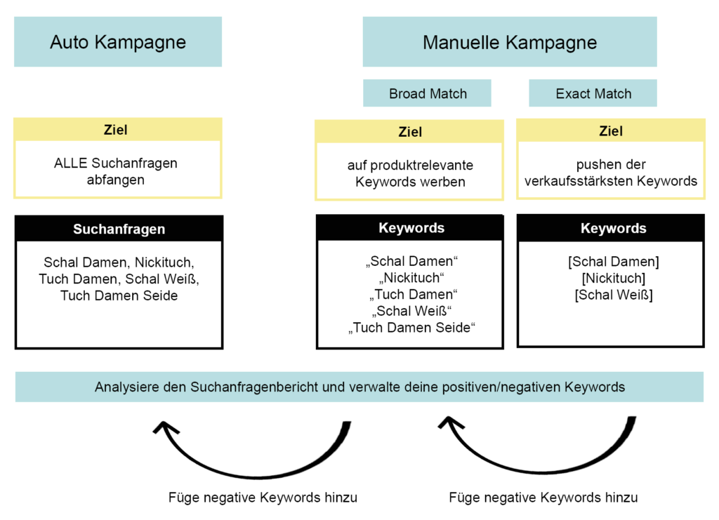 - Um eine Kannibalisierung der Kampagnen zu verhindern, sollten Suchbegriffe, die in der Kampagne mit “breitgefasster (broad) Übereinstimmung” vorhanden sind, in der Kampagne mit automatischem Targeting als negative Suchbegriffe mit der negativ exakten Übereinstimmung eingebucht werden. Ebenfalls sollten alle Suchbegriffe in der Kampagne mit “exakter Übereinstimmung” sowohl in der automatischen als auch in der breitgefassten Kampagne als negativ exakt eingebucht werden. So garantieren Sie, dass keine der Kampagnen für dieselben Suchbegriffe ausgespielt wird.