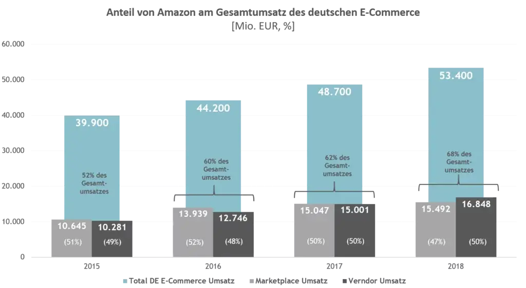 Amazon ist der Verkaufskanal schlechthin im E-Commerce. Im Jahr 2018 positionierte Amazon sich mit über 50% Marktanteil in DACH (Deutschland, Österreich, Schweiz), während in Deutschland sogar ein Marktanteil von 68% erreicht werden konnte.