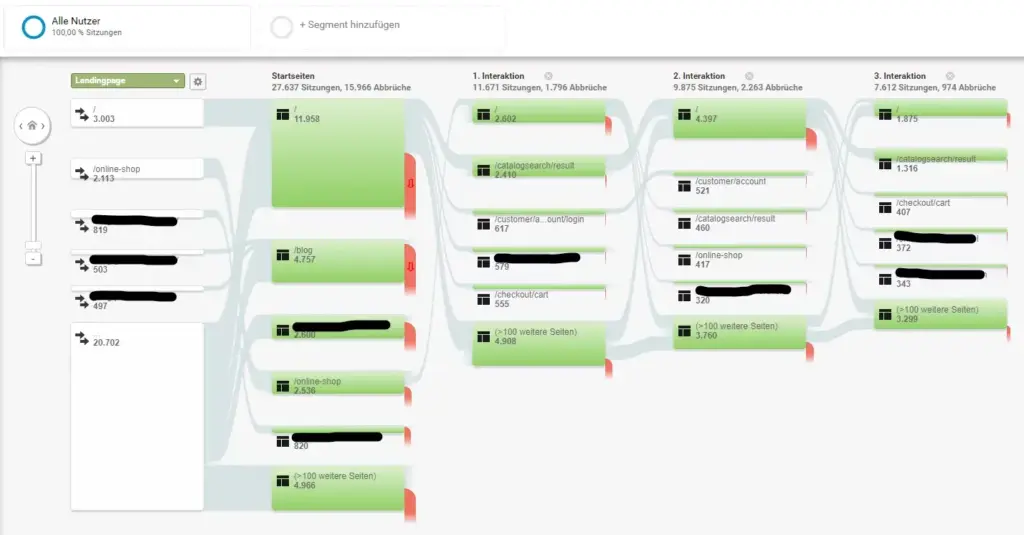 Die obige Abbildung aus Google Analytics zeigt den Verhaltensfluss aller Besucher auf einer Webseite. Wie man erkennt, starten zu Beginn 27.637 Nutzer auf der Startseite. Eine erste Interaktion tätigen 11.671 Nutzer, also weniger als die Hälfte (15.966 Abbrüche). Eine dritte Interaktion tätigen dann nur noch 7.612 Nutzer. Anhand dieser Abbildung kann man erkennen, an welcher Stelle viele Nutzer die Seite wieder verlassen.