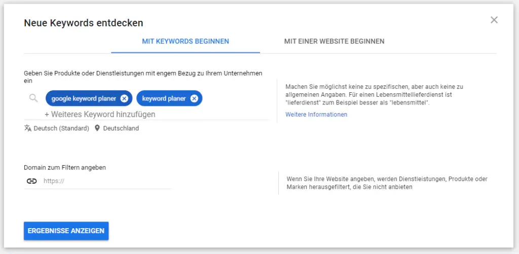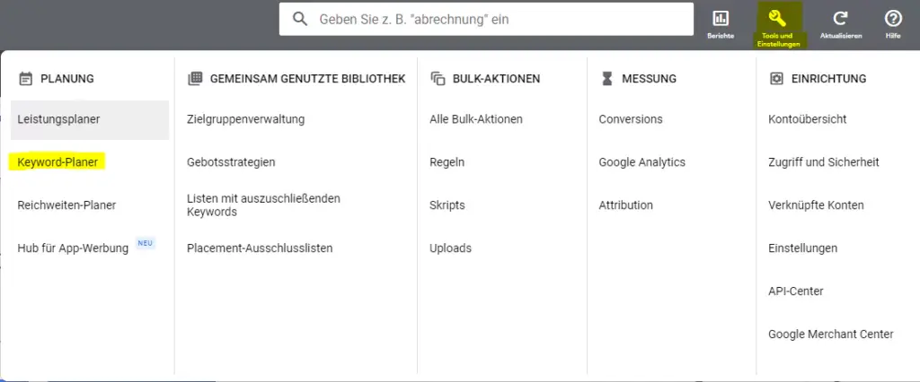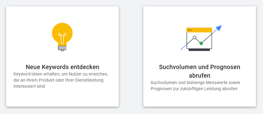 Um auf den Keyword Planer zugreifen zu können, müssen Sie sich im ersten Schritt in Ihr Google Ads Konto einloggen. In der oberen Leiste finden Sie unter “Tools und Einstellungen” den Reiter “Planung”. Sobald Sie die entsprechende Kategorie “Keyword-Planer” anklicken, gelangen Sie zum Google Keyword Planer und finden folgende Oberfläche vor:
