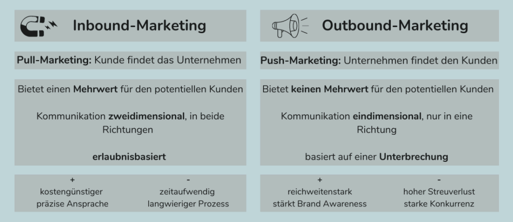 Im traditionellen Marketing liegt der Fokus weniger auf einer zielgruppenorientierten Ausspielung, viele Unternehmen setzen noch auf Kaltakquise und andere traditionelle Marketing Werkzeuge. Doch der Umschwung im Marketing hat schon lange begonnen, den Fokus darauf zu richten, dass die Suche des Kunden erfolgreich ist und er auf unser Unternehmen aufmerksam wird. Durch qualitative Inhalte wird die Aufmerksamkeit geweckt. Wie sich das klassische Outbound-Marketing vom Inbound-Marketing unterscheidet wird im folgenden erläutert:
