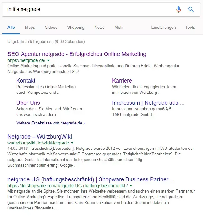 Ebenso kennen Sie sicherlich diesen Moment: Sie suchen nach etwas Bestimmtem, werden aber mit Seiten zugeschüttet, die das finden erschweren, da diese nicht die nötigen Informationen beinhalten. Aber durch den folgenden Befehl können Sie sich die Keywords in den Titeln der Suchergebnisse anzeigen lassen. Dadurch erhalten Sie genauere und relevantere Infos zu Ihrem gewünschten Thema. Dies sähe dann wie folgt aus: