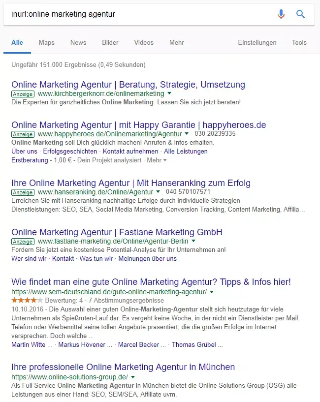 Sagen wir, Sie wollen eine Kampagne starten, um neue Partner oder Kunden anzuwerben. Im Folgenden nehmen wir das Beispiel einer Online Marketing Agentur. Durch den unten aufgezeigten Befehl kann man alle Seiten anzeigen lassen, die den Begriff „Online Marketing Agentur“ beinhalten.