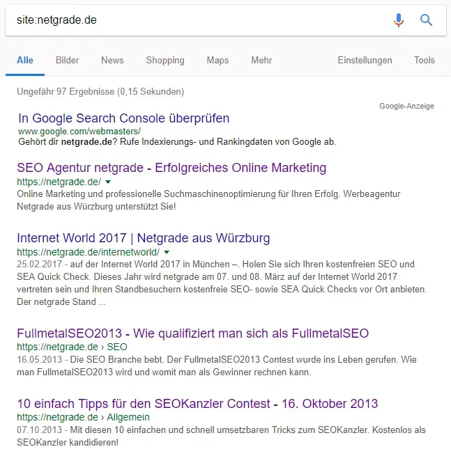Mit dem nächsten Befehl können Sie sehen, welche Ihrer Seiten von der Suchmaschine indexiert wurden.