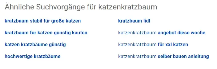 Gehen wir vom Beispiel aus, dass Ihr Katzenkratzbäume vertreibt. Erstellen Sie sich eine Liste, in der Suchbegriffe gesammelt werden und überlegen Sie dann, wie potentielle Kunden nach ihrem Produkt suchen könnten.