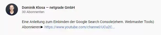 Die ersten 157 Zeichen in der Videobeschreibung sind in den Suchergebnissen neben dem Thumbnail zu sehen. Daher wird empfohlen, das Hauptkeyword dort zu platzieren, um die Aufmerksamkeit des Users auf sich zu ziehen. Hier ist es wichtig, den Fokus auf den Inhalt des Videos beizubehalten. Zudem sollte man immer eine Call-To-Action zum Abonnieren des eigenen Channels einbauen.
