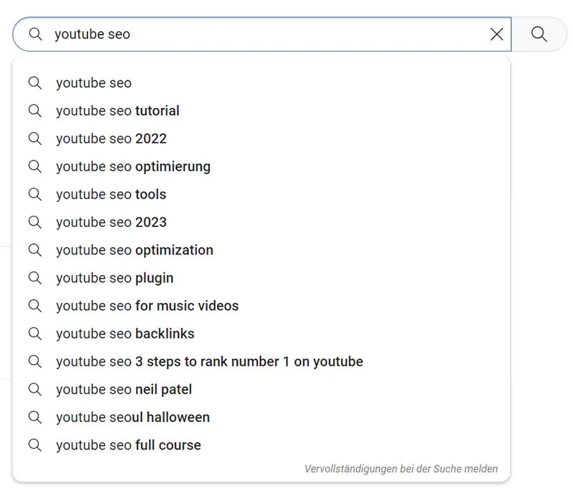Das Seed-Keyword wird einfach in die Suchleiste eingegeben und YouTube wirft alle relevanten Suchanfragen aus, nach denen User gesucht haben.