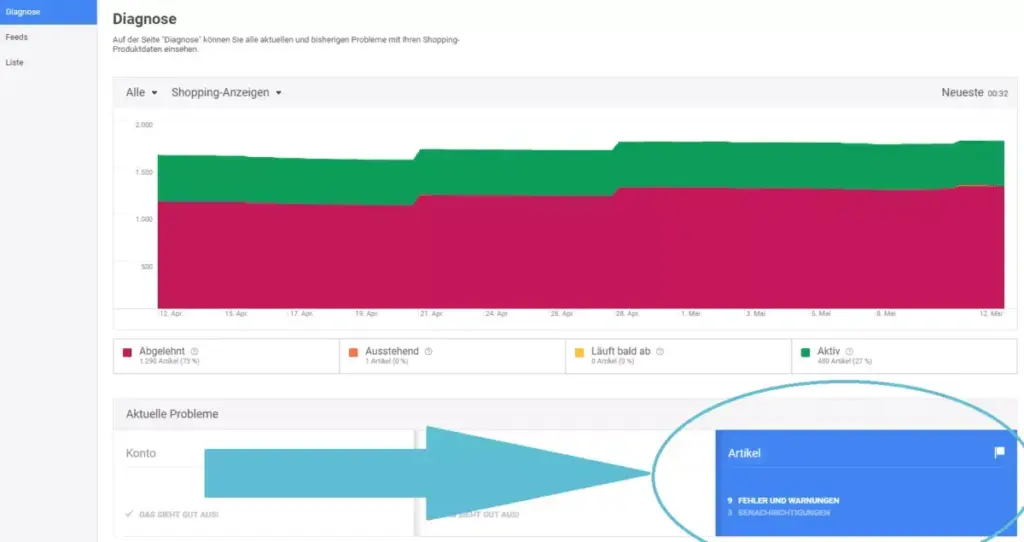 Ob euer Feed Fehler oder die Artikel fehlende Informationen beinhalten, könnt ihr im Merchant Center unter dem Reiter Diagnose sehen.