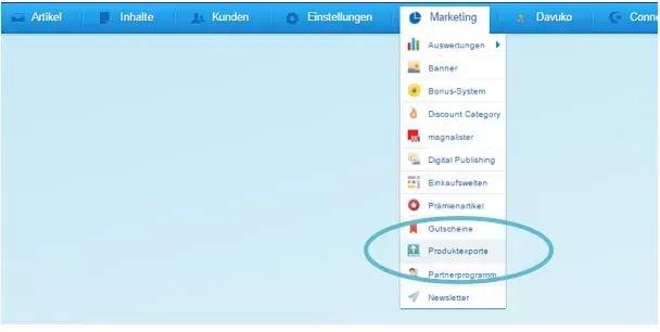 Hier klickt ihr unter dem Reiter ‚Marketing‘ auf ‚Produktexporte‘