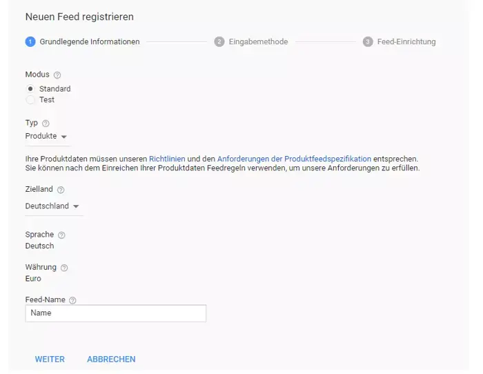 Anlegen eines neuen Feeds im Google Merchant Center