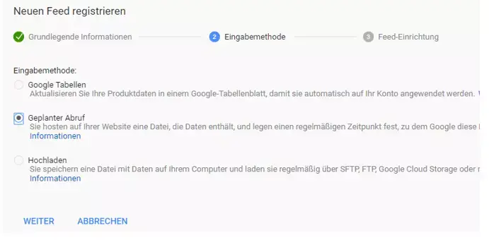 Im zweiten Schritt wird die Methode angegeben, mit welcher man den Feed übergeben möchte. Hier musst du nun ‚Geplanter Abruf‘ auswählen.