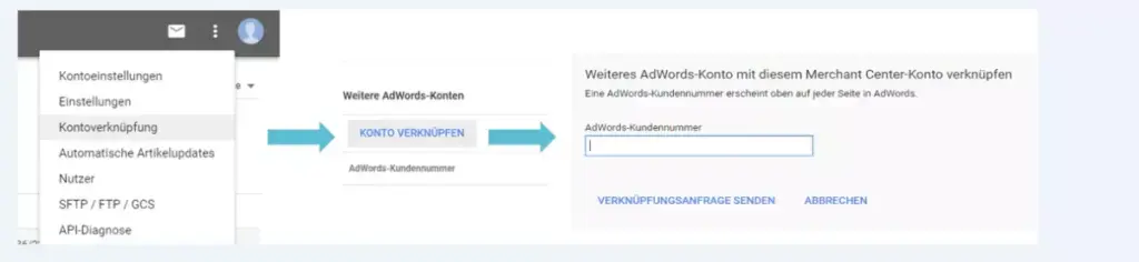 Um nun die Produktdaten an Google zu übergeben, muss man sich in das Google Merchant Center einloggen. Das Google Merchant Center muss hierfür mit dem AdWords Account verknüpft sein.